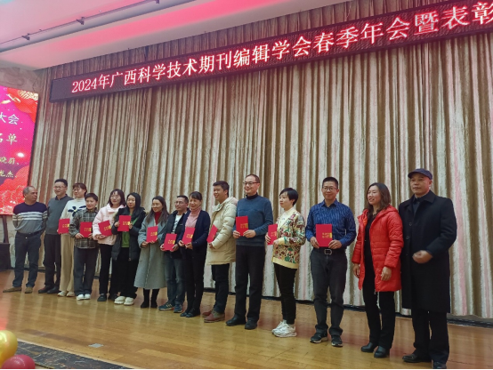 1月26日下午,“2024年广西科学技术期刊编辑学会春季年会暨颁奖大会”在广西药用植物园怡养花园大酒店举行,来自全区科学技术期刊界58家单位的100余位代表参会。会议公布了全区2022-2023年度项目优秀奖、优秀主编、优秀编辑部主任、优秀编辑、科普先进个人、优秀科普策划人、年度十佳期刊、年度优秀期刊等奖项获奖名单。我校侯代忠被评为“2022-2023年度优秀主编”、张震英被评为“2022-2023年度优秀编辑部主任”、玉璐被评为“2022-2023年度优秀编务”,《南宁师范大学(自然科学版)》被评为“2022-2023年度广西优秀科技期刊”。