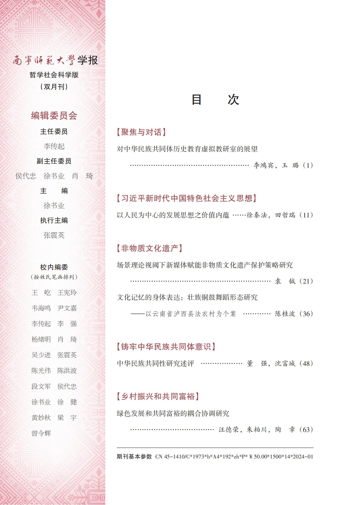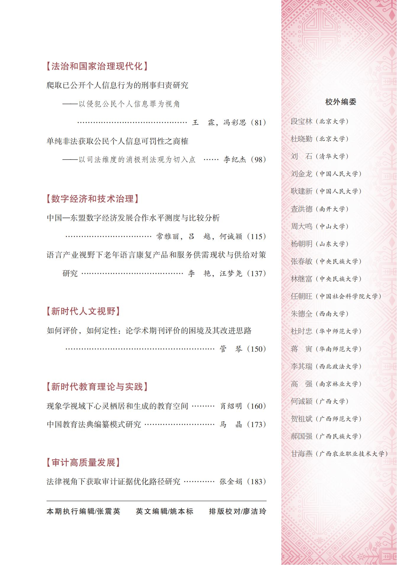我刊关注新时代经济社会发展中的理论与现实问题,着重选用观点明确、结构严谨、论证充分、引证可靠、表达流畅、有创新性和学术价值的学术研究成果。从2023年起,哲学社会科学版逐步完成了对以一级和二级学科为标题的栏目改造,实现了栏目向专题化、前沿化与精细化发展的良好势态。目前有非物质文化遗产、铸牢中华民族共同体意识、乡村振兴和共同富裕、法治和国家治理现代化、审计高质量发展五个常设栏目,其中“非物质文化遗产”于2010年、2023年两度被评为“全国高校社会科学期刊特色栏目”;改造旧栏目形成了聚焦与对话、城乡融合和区域高质量发展、数字经济和技术治理、传统文化的当代阐释、新时代人文视野、新时代教育理论与实践六个栏目;新增了习近平新时代中国特色社会主义思想、马克思主义中国化时代化、建设中华民族现代文明三个栏目,最终形成了14个栏目的基本格局,每期根据约稿和来稿情况具体分析、整体权衡、灵活出刊。